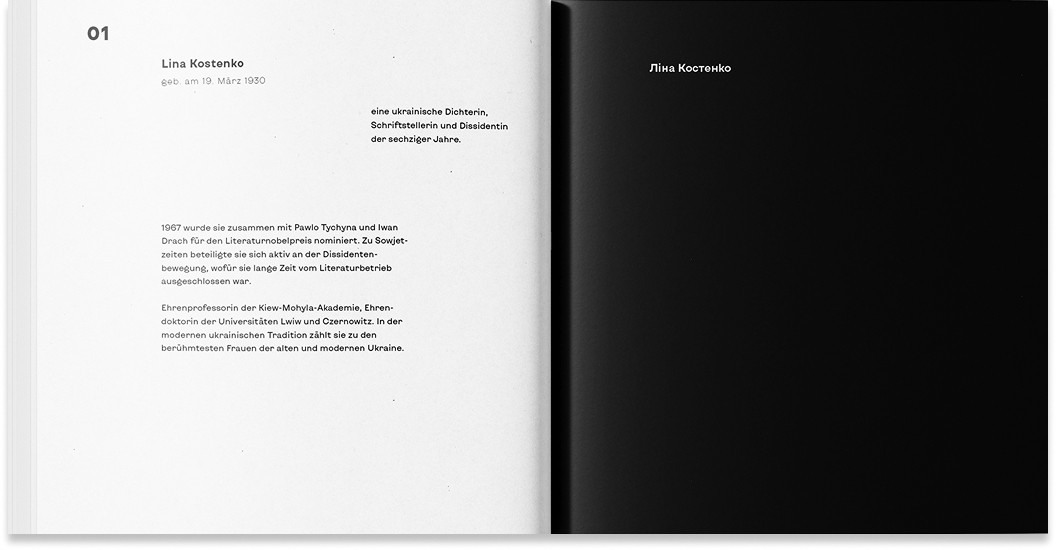 The book is pure black-and-white, with red for sharp accents – both code and memory: red as protest, warning, love, the thread of collective memory. Each poem starts with a German intro about the author, followed by the poem in Ukrainian, and a short commentary in prose (also in German), offering a bridge between worlds.